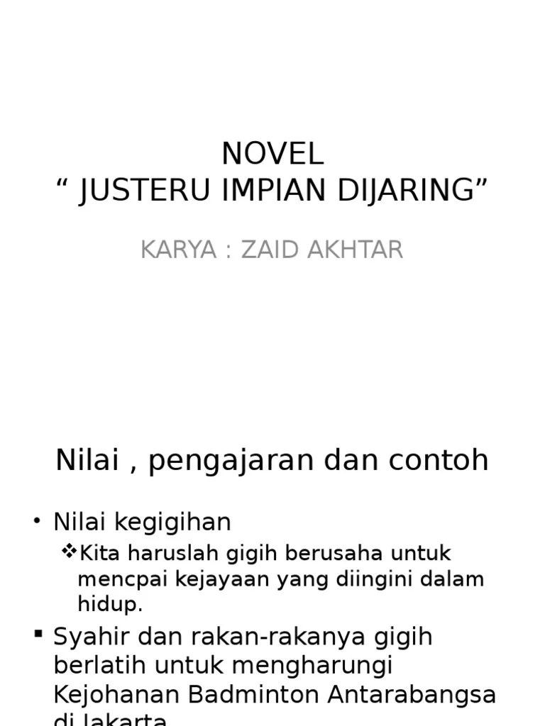 ١٨ ذو القعدة ١٤٤٢ هـ. Nota novel justeru impian di jaring. Novel justeru impian di jaring ini merangkumi nota bagi sinopsis, tema dan persoalan, watak dan perwatakan, teknik plot, plot, gaya bahasa, . Novel justeru impian di jaring . Novel justeru impian di jaring mengisahkan perjalanan hidup seorang pemain badminton skuad kebangsaan bernama syahir.
